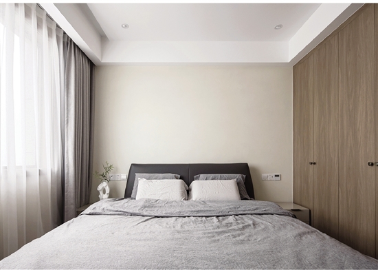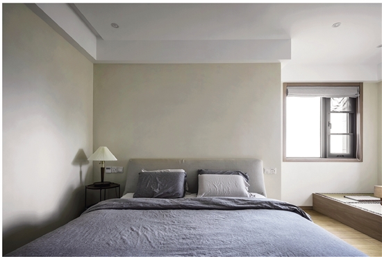 主卧作为主人的起居空间,采用舒缓和通透原则,没有多余的装饰,利用木质和白色、米黄色的墙、顶面,让空间更有层次感。主卧的东南角还有一个临窗的日式榻榻米,特别舒服,衣帽间是开放式的,山上没什么灰尘,又能保持更好的通风。