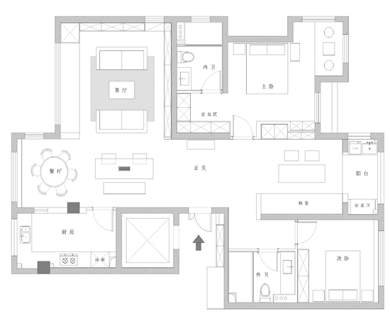 该户型另一特点是飘窗多,主卧飘窗可以享受到270°无遮挡景观,十分符合度假房的需求;多功能房连通阳台,室内又做了一个靠墙的卡座,平时做茶室,有朋友来了可变为客房。客厅虽然朝北,但设计师将朝北的观景阳台纳入客厅,扩大面积,更宽敞明亮。