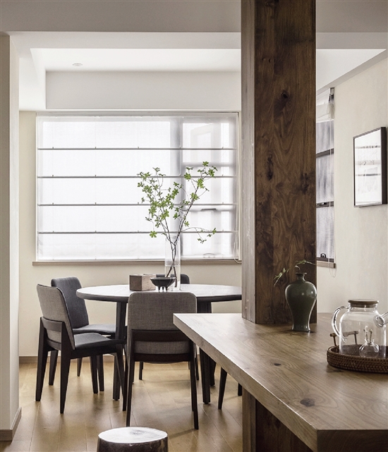 这张用老木头定制的长桌,后期增添了一个木质柱子,看似多余, 却增加了空间的厚重感。长桌变成了餐厅、客厅的交汇点,无论搭配哪个空间使用,都非常合适。