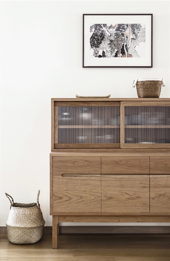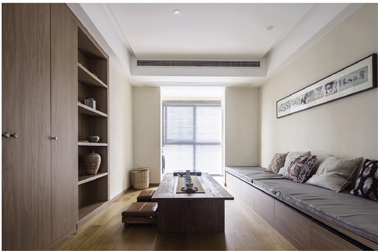 本案还融入了日本的侘寂美学,东面墙体的壁龛内放置着业主收藏的茶具、陶瓷艺术品,精心的摆放,赋予了空间宁静、专注的氛围。这样的气质还体现在客厅的沙发、飘窗、茶几等元素中。单一浅灰色的布艺沙发和飘窗垫,搭配色彩丰富的小抱枕和几何地毯,让整个客厅古朴又不单调。