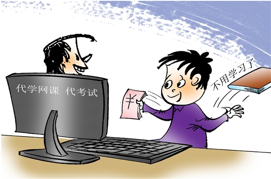 据报道,当前,我国的慕课数量和应用规模位居世界第一。新冠肺炎疫情期间,慕课更是成为高校教学的重要组成部分。但网课一派繁荣的背后,十几元甚至几元钱即可购买“代学网课、代考试”一条龙服务,已在部分高校成为公开的秘密。这样的“付费刷课”不仅影响高校网课教学公信力,对高等教育质量也造成冲击,亟须综合治理。 (陶小莫 画)