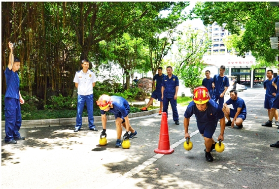 炎夏的操场,骄阳似火。消防指战员在烈日下进行长跑、400米疏散物资、俯卧撑、单双杠等项目的强化体能训练。训练中,消防指战员不畏炎热,高温下历练自我,快速提升自身的能力。