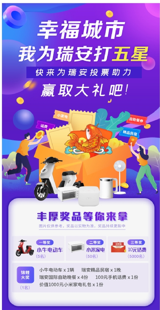 投票成功后,大家可参与抽奖活动,将有机会获得丰厚礼品。参与抽奖流程:点击微信公众号“瑞安发布”菜单进入“抽奖登记”页面,完成抽奖信息登记(若为单位职工,需选择自己所在的单位),随后上传个人资料截图和投票结果截图并提交抽奖。奖品有一等奖5名,送小牛电动车一辆;二等奖50名,小米家电一件;三等奖5000名,送10元话费。更有锦鲤大奖,包括小牛电动车一辆、瑞安精品民宿一晚、瑞安国际自助晚餐4份、价值1000元的小米家电礼包、100元手机话费。