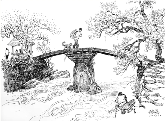 走进茅亭,一群小青年正在野炊,斑驳陆离的光影打在他们脸上,却是如此有活力,年轻就是好哦,我在心里感慨着!他们告诉我说,这是“大脚桥”,我们少时就是这么叫的,你看,它的脚有多大?方言里的“大”,既有“大”的意思,也有“独”的意思。这个桥名,倒也是名副其实的!迈步其上,桥面由三块石板组成,桥长八九米,北面是三级石阶,南面只有二级,石板在时光的浸润之下,显得精光溜滑,满是岁月的沧桑。