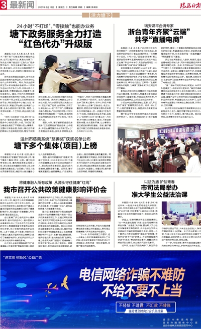 “依托‘三级联动’平台,我们将‘红色代办’服务进行再升级。”据塘下政务服务中心相关负责人介绍,“升级版”更加精准地满足了不同群众的办事需求,主要针对年老体弱、残疾人等行动不便的群体以及在异地的村民,增加了视频授权功能,本人无法到场办理的启用录制视频办理。原先群众需要在工作日前往村居,与代办员面对面交流提交材料,现在打破了时间、空间限制,实现了社保业务24小时“不打烊”,无需接触也能办理业务。“无论何时何地,村民只需要按照流程录制一个视频,其他的就交给村居和政务服务中心即可。”该负责人说。