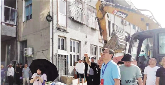 在南岸走访中,一行人看到一幢民房后侧有工人正在拆违,挖掘机等设备停靠在岸边。据住户反映,凤渎河南岸环境综合整治工程即将进场施工,此次还增加了房屋的外立面改造项目,因此需拆除墙体上的违建。