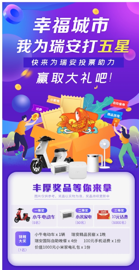 据悉,2021年“中国最具幸福感城市”调查推选活动目前正在进行中,奖品有一等奖5名,送小牛电动车1辆;二等奖50名,送小米家电1件;三等奖5000名,送10元话费。更有锦鲤大奖,包括小牛电动车1辆、瑞安精品民宿1晚、瑞安国际自助晚餐4份、价值1000元的小米家电礼包、100元手机话费。目前,一、二、三等奖分别还剩2份、18份、1000多份,更有锦鲤大奖等你。