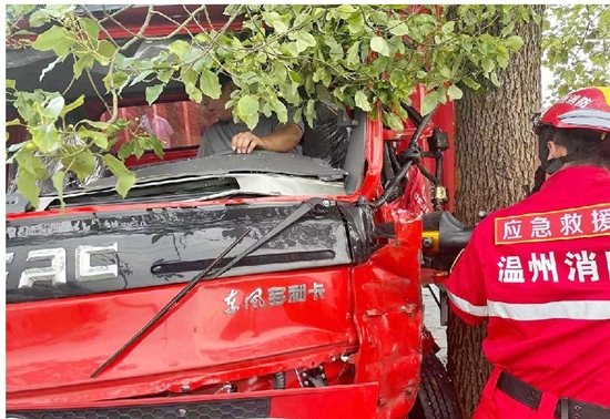8月19日16时12分,瑞枫线陶山镇河西村路段发生一起交通事故,一货车司机因疲劳驾驶撞向路边的树上,造成自身被困。
