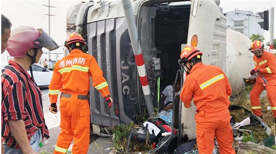 消防救援人员到场后,立即利用液压破拆工具进行破拆救人。救援人员一边谨慎操作,一边不停安慰被困驾驶员,经过10余分钟的紧张救援,被困司机被成功救出。