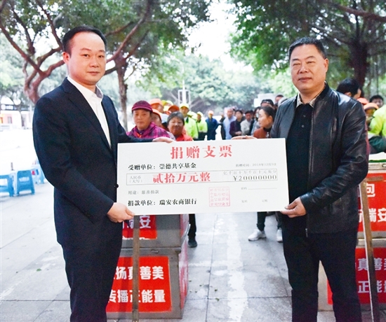 该行先后出资200万元设立“瑞安农商银行——最美瑞安人基金”;捐款100万元成立防疫基金,为全市1万多名村(社)干部、党员志愿者和医护人员购买专项保险;还出资500万元成立村(社区)干部教育培训基金、出资300万元成立“瑞安农商银行·乡贤发展基金”等,支持当地慈善事业发展。