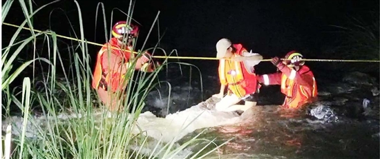 此时天空仍旧下着雨,夜晚山中温度极低,被困人员饥寒交迫。现场指挥员立即制定救援方案,几名经验丰富的消防员携带水面漂浮绳和救生衣前往对岸,在固定好救生绳后让被困人员穿上救生衣,随后在消防人员的接力下逐一涉水通过湍急溪流。由于雨天路滑,救援人员针对多名未穿鞋子的被困人员采取背负的方式进行转移。