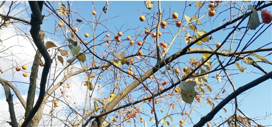 三棵柿子树缠绕在一起,躯干苍劲有力,分丫出许多枝条,枝条在空中肆意生长,弯曲成各种形状,率性淋漓,好似哪位书画家的醉后泼墨。枝条上又长出无数的细枝,叶子已经所剩无几,一个个红灯笼一样的柿子就密密麻麻挂在细枝上,映衬在蓝宝石一般的天空与天鹅绒似的白云下,像无数的星星眨巴着眼睛,美得让人目炫。