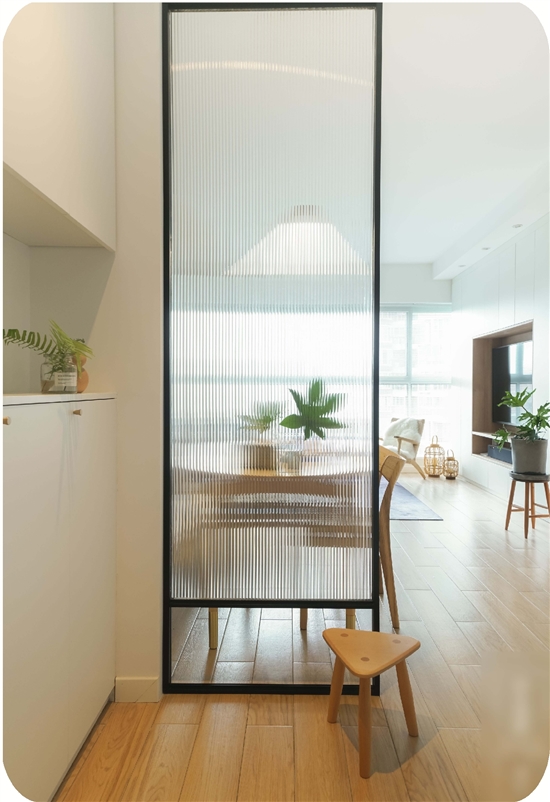 这种金属框加玻璃的隔断,尤其是黑框,普遍受人们喜欢,成为近年来玄关隔断的热门选择。它使用简单的几何线条,大屏玻璃作装饰遮隔,既可以分隔大空间,又能保持空间的完整性,符合当下简约自然的装修风格。图中的长虹玻璃作为隔断,犹如屏风一般,既能避免开门后一眼望穿的尴尬,也不耽误采光。
