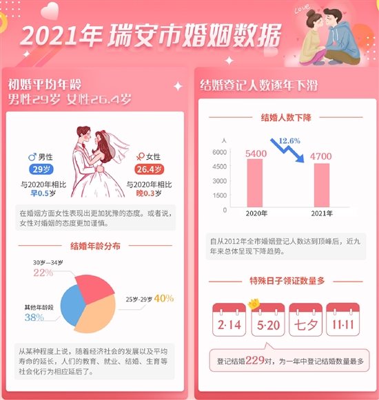 2021年,选择在一些特殊的、具有纪念意义的日子“扯证”依旧是风潮,5月20日当天登记结婚229对,是全年登记结婚人数最多的一天。此外,双十一、农历七夕、2月14日,也是登记结婚的热门日子。市婚姻登记处预测,2022年2月22日也是一个结婚登记高峰。