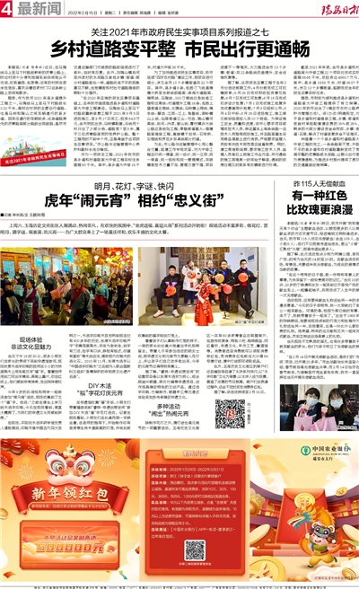 截至2021年年底,全市县乡道和村道路面大中修工程22个项目已完成实际里程55.65千米,总投资达4950.7万元。其中,县乡道19.58千米、村道36.07千米,涉及13个乡镇街道,超额完成全年的民生实事目标任务。