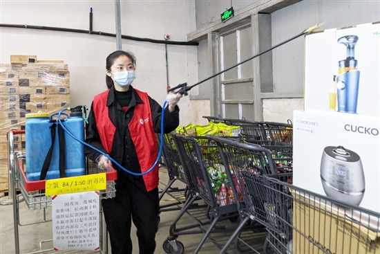 此外,超市还严格做好员工的管理,每日测体温,戴口罩、手套上班,做好“大物防”“人物同防”。