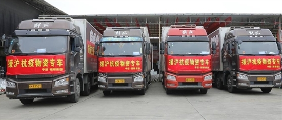 当天下午,将最后一批蔬菜等物资装车后,满载百吨肉蛋菜等食品的4辆冷链车,挂着“竭诚支援上海市闵行区全力抗疫”的红色横幅,统一在瑞明集团发车,驰援上海闵行区七宝镇。