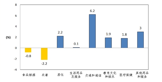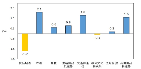除了食品烟酒价格环比下降,其他七大类价格环比六涨一降。其中,衣着价格上涨2.1%,交通和通信价格上涨1.8%,其他用品和服务价格上涨1.6%,生活用品及服务价格上涨0.8%,居住价格上涨0.6%,医疗保健价格上涨0.2%,教育文化和娱乐价格下降0.1%。