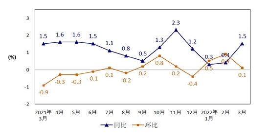 本报讯(记者 黄丽云 通讯员 刘菲菲)3月份,我市居民消费价格(CPI)同比上涨1.5%,涨幅比上月扩大1.1个百分点, 其中食品价格下降3.0%,非食品价格上涨2.6%;消费品价格上涨2.0%,服务价格上涨0.7%;环比上涨0.1%,涨幅比上月回落0.8个百分点,其中食品价格下降2.5%,非食品价格上涨0.8%;消费品价格上涨0.3%,服务价格与上月持平。这是记者前日从市统计局获悉的。