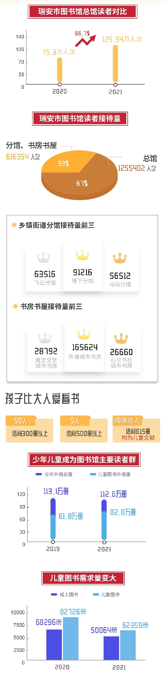 当智能手机、电子阅读变得普遍而便捷时,依然有很多人热爱纸质阅读,捧一本书细细品读。4月23日是“世界读书日”,近日,市图书馆发布2021年度“阅读数据”,2021年,该馆共接待读者187.17万多人次,其中总馆125.54万人次,分馆、城市书房(百姓书屋)61.6354万人次。全年外借图书112.6万册,其中少儿图书82.8万册。年度“阅读达人”一年借阅图书达615册。