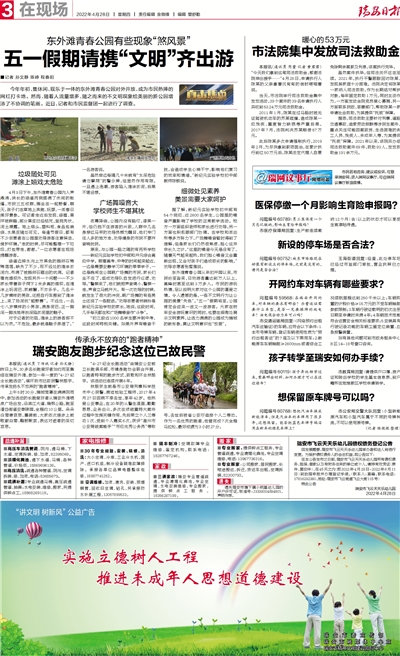 东外滩青春公园从年初开园以来,市民纷至沓来,日均游客量达到万人以上,高峰时甚至达到3万多人。市民的游玩热情,足以说明大家对这个公园的喜爱之情。令人遗憾的是,一些不文明行为让公园的美景“失色”。“五一”假期将至,公园肯定会迎来一波又一波游客。大家在树牢安全游玩意识的同时,也要在细微处展示文明素养,让活力满满的公园成为瑞城的新形象,莫让文明意识也“放假”。