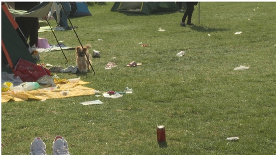 4月9日下午,东外滩青春公园内人声鼎沸,狭长的绿道两侧搭满了休闲的帐篷,市民三五成群,围坐在一起野餐、聊天,孩子们在草地上奔跑、玩耍,一派春日美好景象。可记者走近后发现,绿植、草坪被踩踏,部分草皮已经枯死,呈斑秃状,泥土裸露。地上烟头、塑料瓶、食品包装袋、水果皮随处可见。每逢节假日,都有不少志愿者在公园里劝导游客注意保洁,爱护环境。“走的时候,尽可能整理一下垃圾,打包带走,谢谢。”一位志愿者在现场提醒游客。