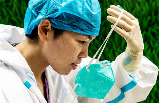 做完最后一个采样、再次核对当天所有的采样信息、清理“战场”、消毒……11时50分许,连续奋战一上午的蔡明明终于松了一口气,脱下防护服,额头几道泛红的印子格外醒目,被汗水浸泡的双手也有些微微泛白起皱。