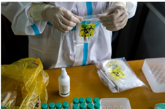 此时,她终于有空坐下来和记者聊上几句。“我是今年初到市府核酸检测点的,每个工作日上午,我都会在这里做核酸,下午再回到科室,继续干自己的本职工作。”蔡明明说,作为点上的负责人,每天上午她会提早半小时来到检测点,查看仓库的物资是否充足,为每个采集位准备好采集使用的物资。采集结束后,她还要进行“扫尾”。