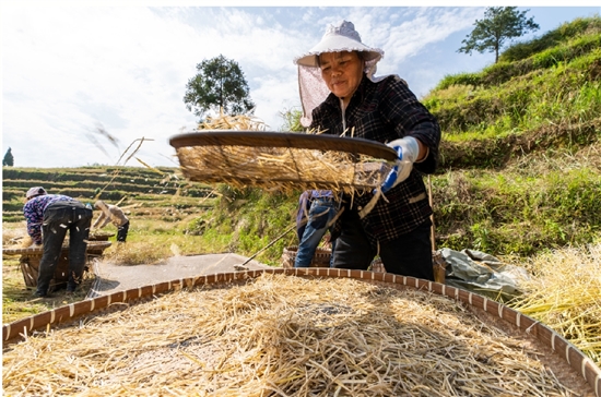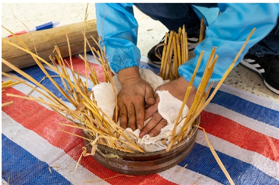 说话间,农户们已经开始了收集菜籽的工作了。田间铺开一大张竹席,只见一位大姐抓起一把收割好的油菜杆,将有着满满菜籽荚的一头不断地在席子上碾压,里面的菜籽都被碾压在竹席上,再通过竹筛将空荚筛出。筛选出来的油菜籽要在烈日下暴晒五天,而油菜杆就会被农户收回家中当作柴火。