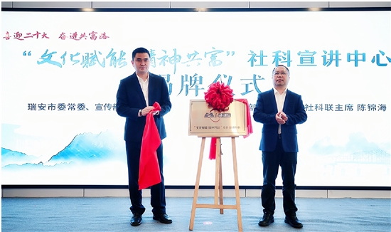 启动仪式上,市委常委、宣传部部长孙寒星,市委宣传部副部长、市社科联主席陈锦海为“文化赋能 精神共富”社科宣讲中心揭牌,孙寒星还向瑞安农商银行党委书记、董事长王光领授牌“玉海讲坛战略合作项目”。全市社科宣讲员队伍也于当天组建,8位社科宣讲员代表接受聘书。