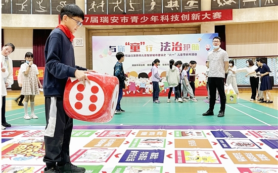“三点,请读出‘我学法,我骄傲’”“五点,跳一跳”……讲座结束后,该校五年级学生来到校体育馆内参加学法游戏。在“普法大富翁”游戏中,学生在一扔一跳一读之中,将法律知识学到手;在“法治知识套圈”游戏中,学生扔出手中的圈,圈中相应的柱子了解相关的法律知识。这些有趣的学法游戏蕴含了家庭教育促进法、未成年人保护法、法律援助法等与儿童相关的法律知识,很受学生欢迎。
