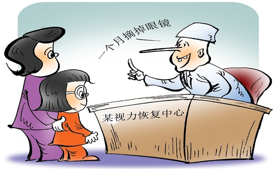 近年来,儿童的近视率越来越高,家长们心急如焚。一些商家趁机以治疗近视为由,推出了各种各样的产品和疗法,打出了“孩子的近视一贴就好”“用了这款近视矫正仪,孩子视力提升了”“一个月摘掉眼镜”等广告。 (陶小莫 画)