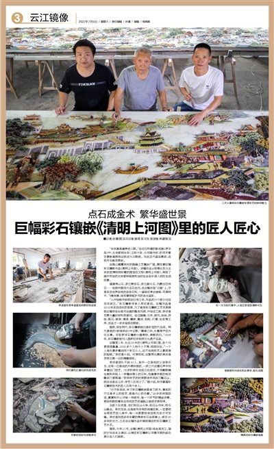 在陶山镇霞林村的陶峰工艺雕刻厂里,摆放着巨幅彩石镶嵌作品《清明上河图》。该幅作品4倍等比放大北京故宫博物院珍藏的国宝级文物《清明上河图》,再现了画中所绘的北宋都城面貌和当时社会各阶层人民的生活场景。