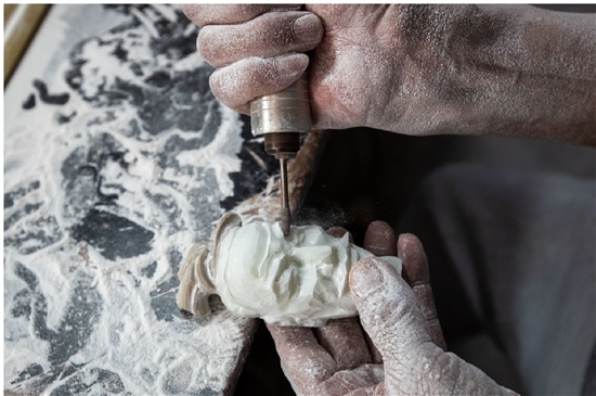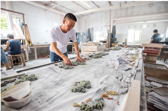 李成者团队不到10人,其中一位是他的父亲李庆龙,还有一位是他的外甥林振欧,一家三代在磨石声中传承着这门技艺。78岁的李庆龙视力还很好,不用戴眼镜也能和年轻人一样雕刻微小的石料,他拿着手里的电动雕刻刀感慨道:“我刚学艺的时候要徒手用刻刀雕石头,现在设备这么好,学艺人反而少了。”据介绍,我市掌握彩石镶嵌技术的匠人仅有十余人。