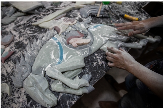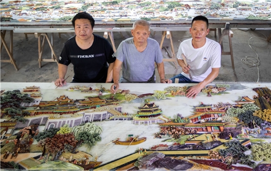 无数个日夜里,他们和石头斗争,和石头作伴,和石头融合。李庆龙说,这是前所未有的鸿篇巨制,一定要把全部技艺投入其中,每一处都要他亲自把关后才可定稿。李成者则把多年珍藏的稀奇彩石全部奉上,倾尽30多年的功力,立志在这幅作品中展现瑞安的彩石镶嵌工艺水平。