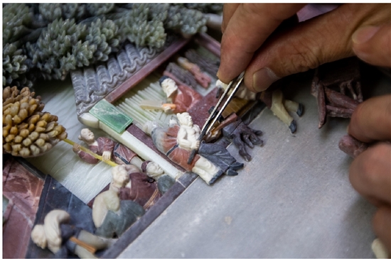 “从开始制作到现在已有三年,作品的六个部分已经完成其五。”彩石镶嵌传承人李成者说。这幅作品是2019年来自深圳的客单,为了能用彩石镶嵌工艺完美展现这幅传世长卷风俗画的整体风貌,开始动工前,李成者花费大量时间构思谋划。经过画稿、勾形、排列、刻线、砑格、配石、框架、填漆、镶嵌、雕刻、粘贴、打磨、包浆等工序,成品才一步步呈现在眼前。