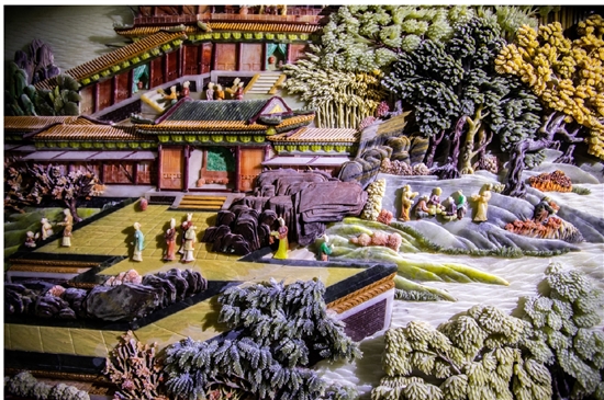 福建寿山石、浙江青田石、浙江昌化石、内蒙古巴林石……包括中国四大名石在内,在这幅巨型“石画”上,尽是来自世界各地的各色石料,一道组成亭台楼阁、花草树木、飞禽走兽,绽放着穿越岁月的流光溢彩。