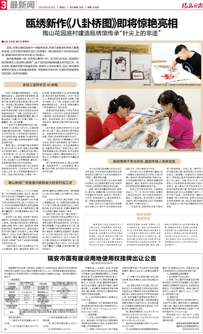 “八卦桥不仅具有独特的历史内涵,也承载了太多陶山人的记忆,这是选择这幅主题作品的初衷。”花园底村党总支书记张庆标说,今年村里将打造新的文化礼堂和瓯绣馆,就邀请了村里的两名老绣工完成这幅以本地特色建筑为主题的瓯绣作品。