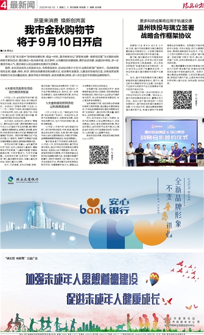 另外,我市将在9月至11月期间,发放汽车消费券,以政企携手铸合力,共促消费信心回归,激发消费购物热情,带动经济增长;金秋购物节还将开展2022瑞安金秋东西协作产品展销活动和“东西协作,山海共富”云上直播节活动。