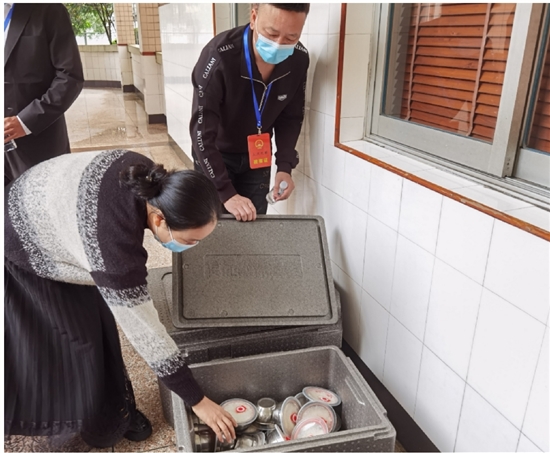 11时许,活动组一行人来到飞云中心小学。此时学生正在上课,配送餐已放在每个教室门口。市人大代表打开一个保温箱,里面泛起一阵热气,菜品是三荤两素一汤,旁边还放着一桶饭,供学生加饭。