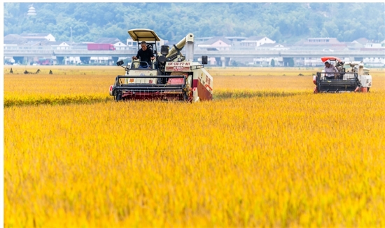 眼下,晚稻收割正渐入高潮。11月10日上午,曹村镇西玉家庭农场人员驾驶收割机来回穿梭在稻田间进行收割作业,伴随着收割机的轰鸣声,金色的稻浪被卷入机械中,切碎的秸秆从收割机尾部搅碎排出,大粒饱满的稻谷尽收囊中。该农场有430多亩农田,种植优质泰两优217品种晚稻。