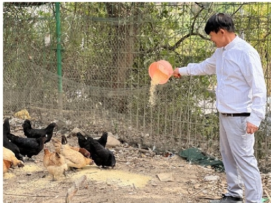 养鸡场的鸡包括本地鸡、无骨本地鸡等,都是诸葛寿喜精挑细选的品种。“养了30多年,鸡得了什么类型的病症,一看就知道。”2011年,他凭借丰富的养鸡经验和理论知识学习,考取了乡村兽医登记证。作为专业的乡村兽医,他有时也会被镇里邀请去给禽畜打预防针。村里谁家养的鸡鸭出现了毛病,也会请他看一看治一治。