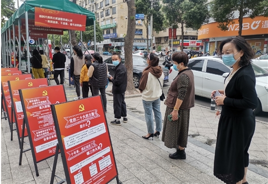 莘塍街道利用核酸采样工作覆盖面广、全民参与的特点,让核酸采样点“兼职”宣讲驿站,利用群众排队等待核酸采样的时机,宣传党的二十大精神。