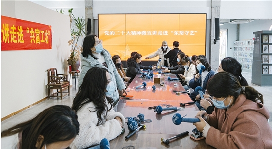本报讯(见习记者 徐心星)12月15日上午,一场别开生面的培训会在平阳坑镇东梨民艺博物馆举行。现场10余名妇女正在学习制作草本养生锤,通过老师们讲解演示,妇女们一边学习,一边制作,不一会,一个个蓝色波点的小锤子就做好了。