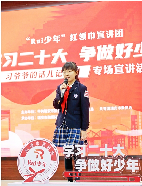 Rui少年红领巾宣讲团由市委宣传部、市教育局、团市委联合主办,市融媒体中心承办,于11月18日成立。首批宣讲团团员由安阳实验小学、马屿镇中心小学等我市15所小学的24名优秀少先队员组成。目前,“学习二十大 争做好少年”已相继开展“十年Rui变 幸福瑞安”“薪火相传 未来有我”宣讲活动,此次宣讲为第三场活动。