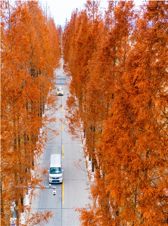 1月5日,我市江曹公路上,植物界“活化石”——红水杉立在千米公路两侧,让人称绝。这里水杉红透,色彩艳丽,美成了一道风景线。 (记者 孙凛)