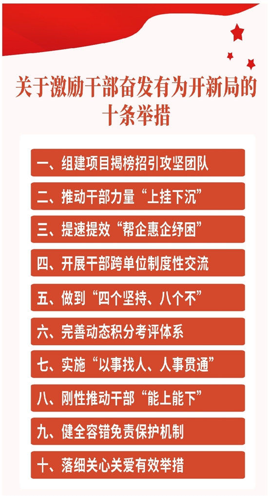 “十条举措”包括组建项目揭榜招引攻坚团队,推动干部力量“上挂下沉”,提速提效“帮企惠企纾困”,开展干部跨单位制度性交流,做到“四个坚持、八个不”,完善动态积分考评体系,实施“以事找人、人事贯通”,刚性推动干部“能上能下”,健全容错免责保护机制,落细关心关爱有效举措等内容。