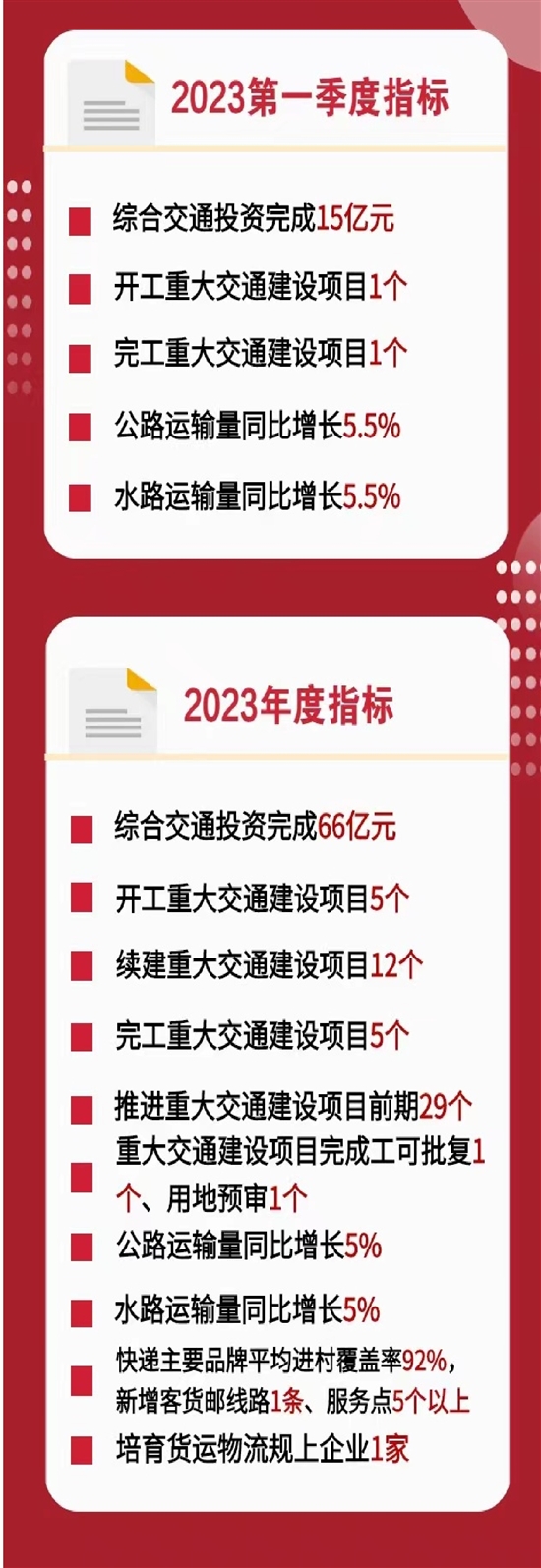 2023年,市交通运输局将认真贯彻全市“赶超再出发、勇闯争一流”拼经济攻改革强创新大会精神,对标“八提攻坚”任务清单,以“大干交通”的实际行动打开城市格局,以“干大交通”的“一等实绩”答好“六问”,切实当好“两个先行”开路先锋,加快打造温州南部综合交通枢纽。