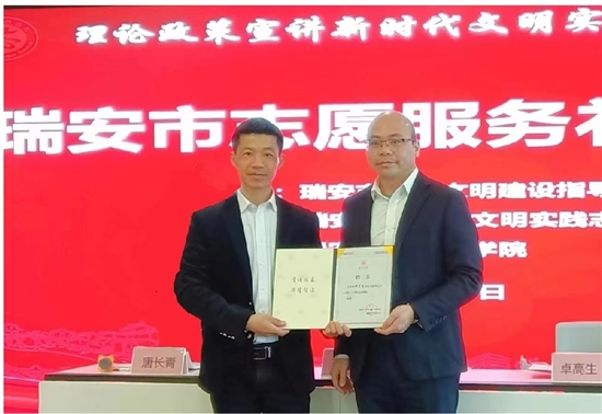 成立仪式上,市精神文明建设指导中心还与温州大学马克思主义学院实施战略合作,在市新时代文明实践中心设立温州大学公益慈善瑞安研究基地。市委宣传部副部长、市精神文明建设指导中心主任邵定美被聘为温州大学马克思主义学院客座教授。