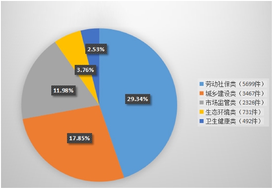 2月,市12345政务服务热线共受理群众来电21998件,其中反映较多的前5类分别为:劳动社保类 5699件,占比29.34%;城乡建设类 3467件,占比17.85%;市场监管类 2326件,占比11.98%;生态环境类731件,占比3.76%;卫生健康类492件,占比2.53%。所有来电直接答复17875件,群众满意率99.03%;交办部门4123件,按期办理率99.97%,规范办理率99.97%,诉求化解率84.69%,群众满意率96.63%。